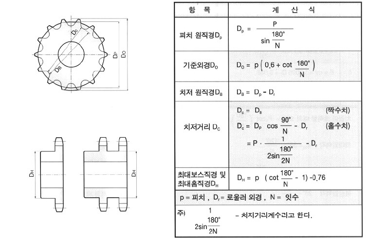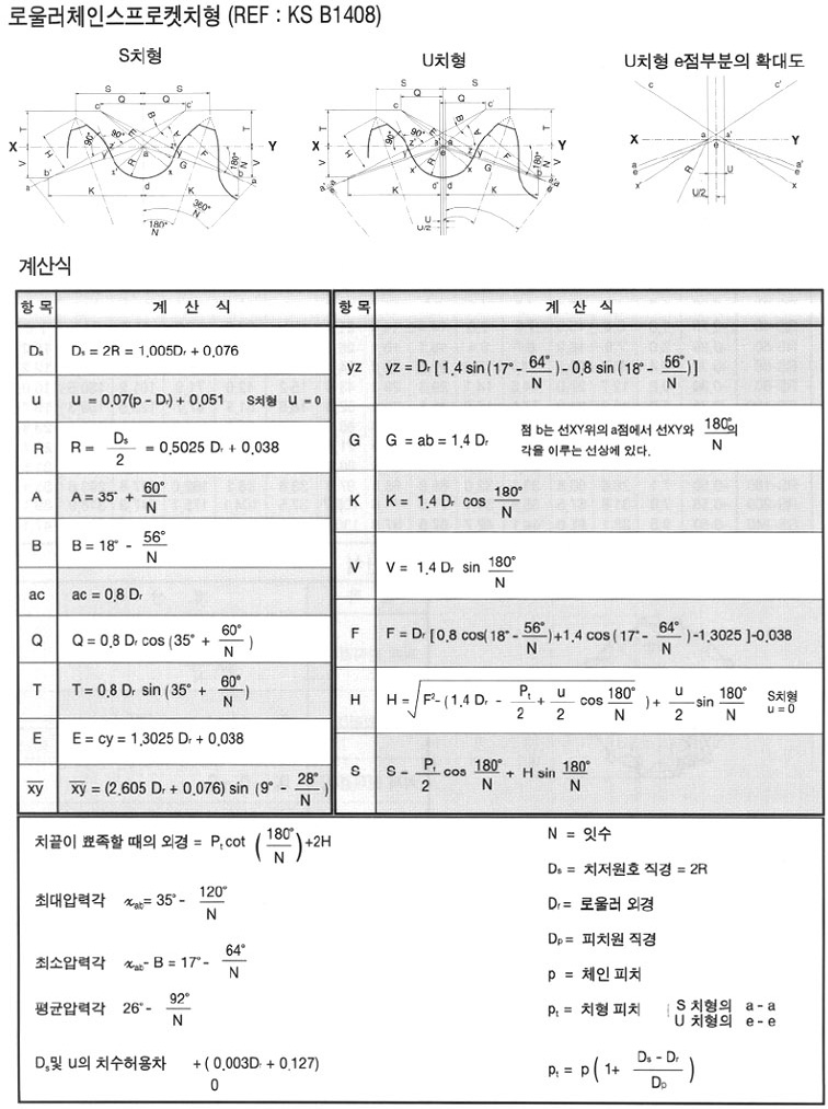 - 체인 전동의 경우 속도 비율을 7:10 이내로 할 것이 보편적인 사용 시항이지만 매우 저속운전인 경우 10:1까지의 속도비도 가능하다.