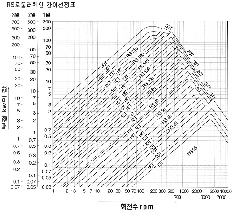 - 작은 스프로켓회전수 500 r.p.m일때 보정 KW = 10KW(종축)와 회전수 = 500r.p.m(횡축)의 교점을 보면 체인은 RS60, 스프로켓은 24T가 된다. 그러나 이경우 교점의 위치는 24T보다 작고, 18T보다 크이므로 교점의 위치에서 23T 또는 24T로 사용할 수 있음이 판단된다.